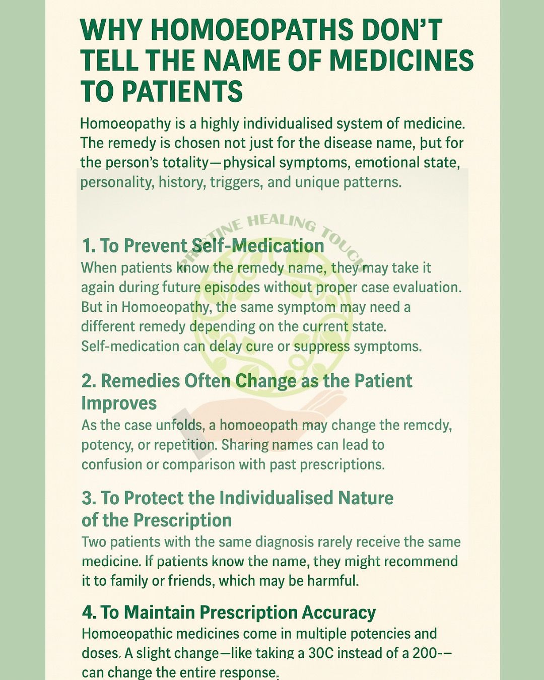 When patients know the remedy name, they may take it again during future episodes without proper case evaluation. But in Homoeopathy, the same symptom may need a different remedy depending on the current state. Self-medication can delay cure or suppress symptoms.
